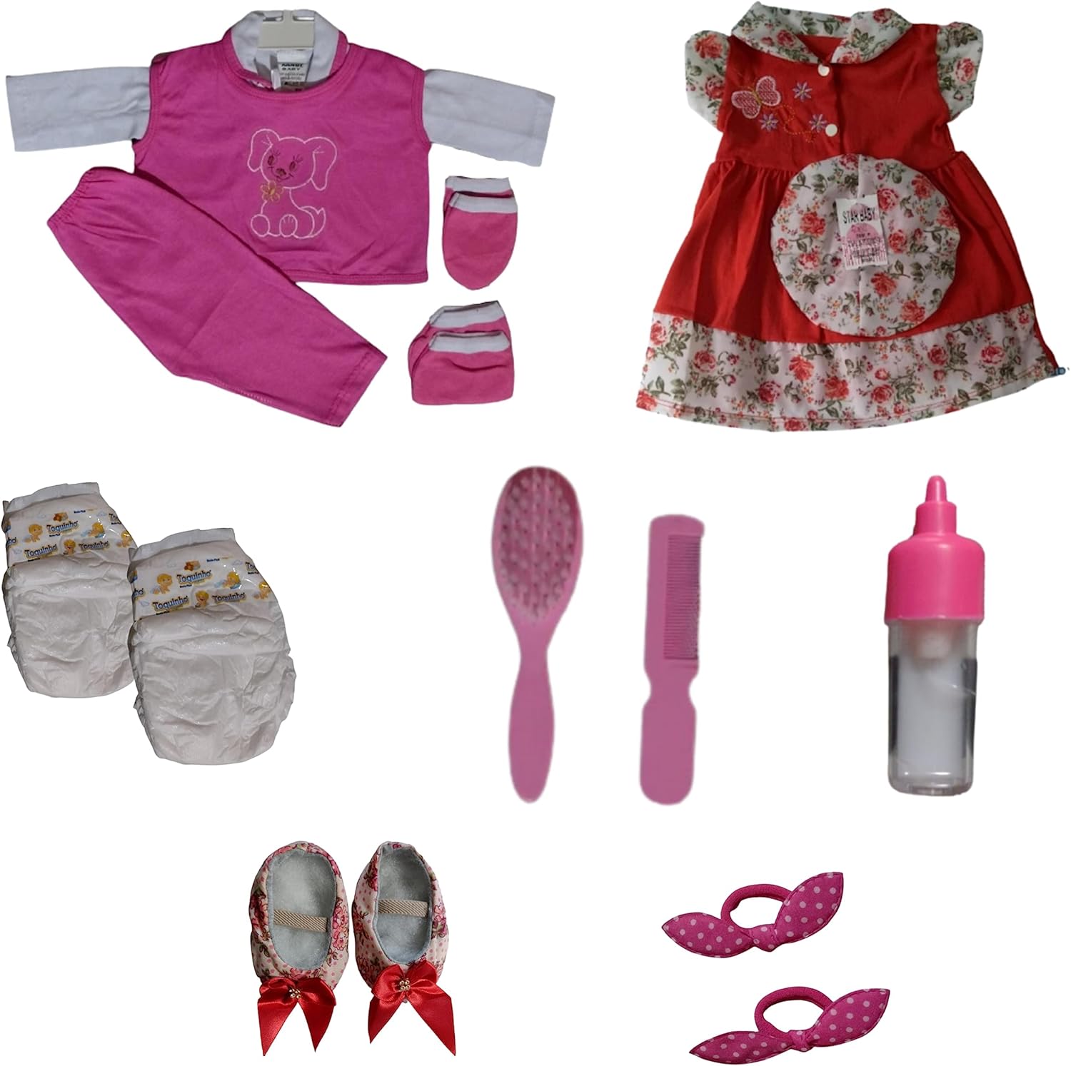 Para deixar a brincadeira ainda mais completa, o kit bebê reborn menina inclui 2 fraldinhas no tamanho RN, 1 escova, 1 pente, 1 mamadeira com leite falso, 2 lacinhos e 1 par de sapatinhos adicionais, oferecendo vários acessórios para simular os cuidados diários com o bebê. Todos os itens foram selecionados para proporcionar uma experiência rica em detalhes e muito mais envolvente.
